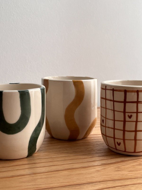 Tazas de cerámica sin asa, hechas y pintadas a mano.