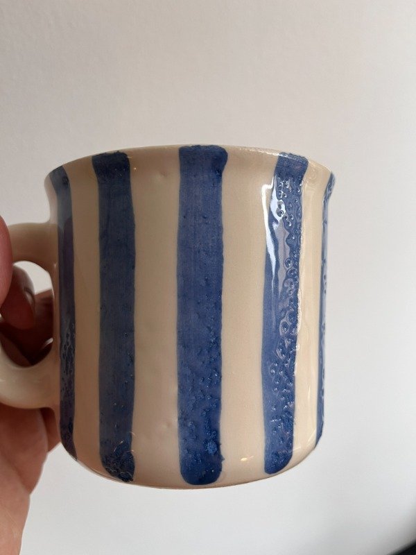 Taza de cerámica hecha y pintada a mano. Contiene una pequeña falla en el esmaltado, que se puede observar de cerca en la segunda foto, pero es solamente una falla visual.